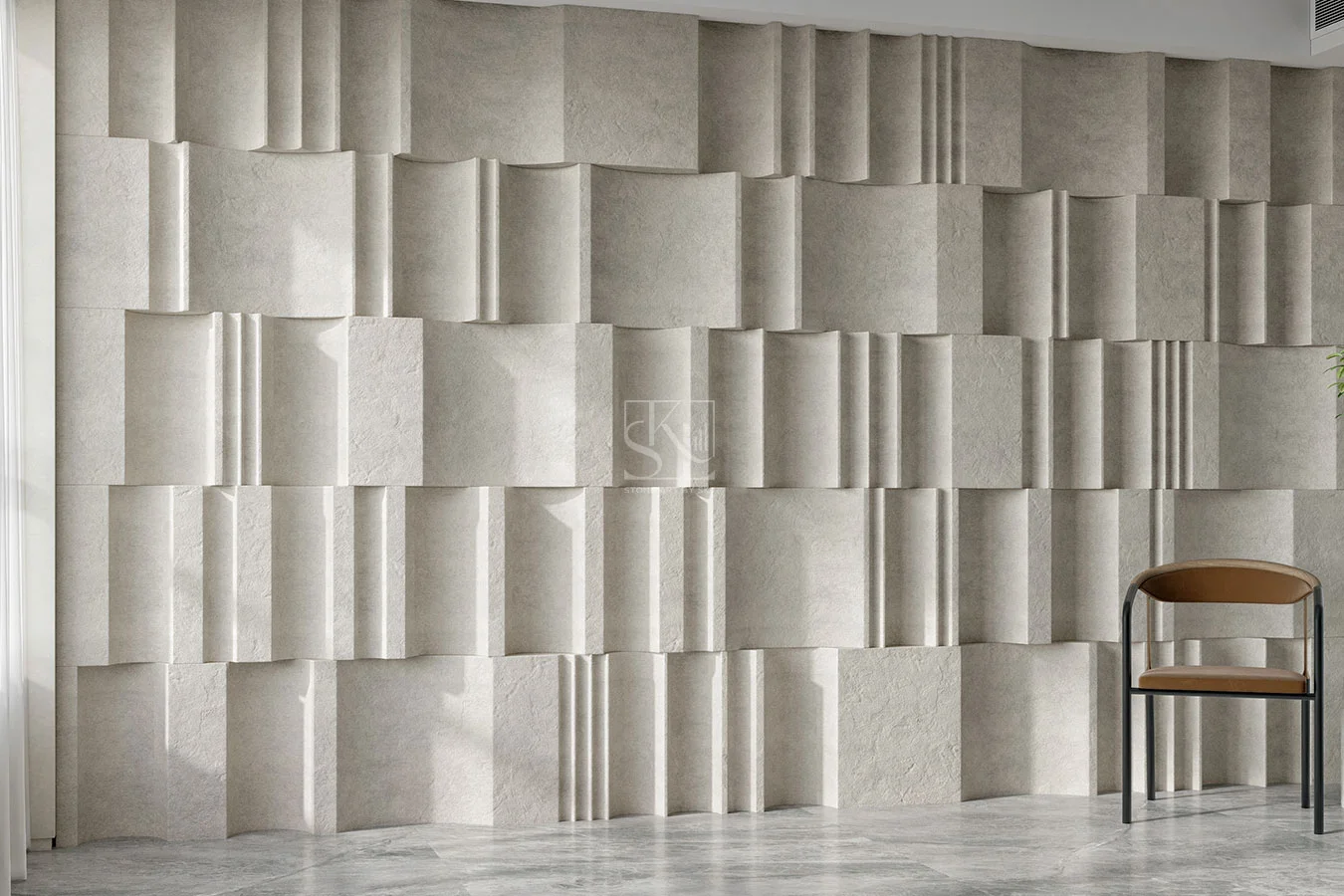 Manufactured by the esteemed Stone Art By SKL, known for their craftsmanship and attention to detail, this design exemplifies their commitment to excellence. Whether it's enhancing the ambiance of a living space, office, or commercial setting, the Curved Fluted Blocks Design creates a striking visual impact.